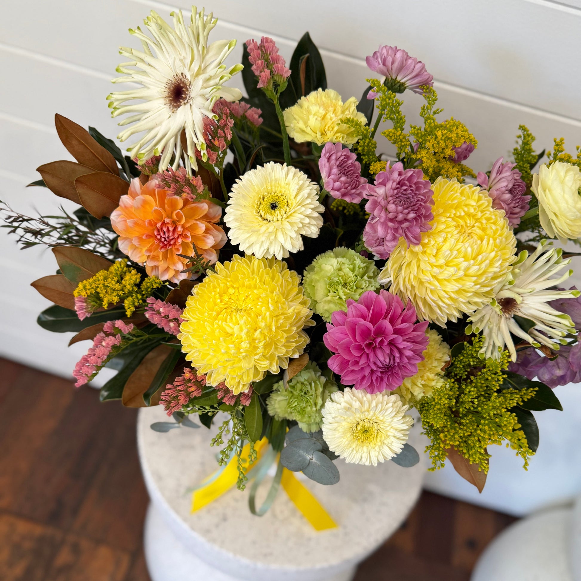 Flowers come arranged into a sage green hatbox with our fun ribbon.