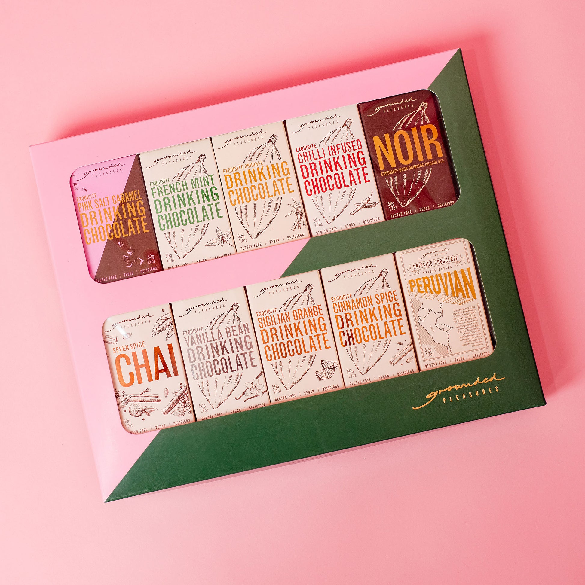 Savor pure delight with the Grounded Pleasures Mini's Gift Pack—10 irresistible mini packs of rich, indulgent drinking chocolate all bundled together. Perfect as a gift, but so delicious you’ll definitely want to keep it for yourself. Cozy up with creamy, chocolatey goodness anytime, anywhere!
