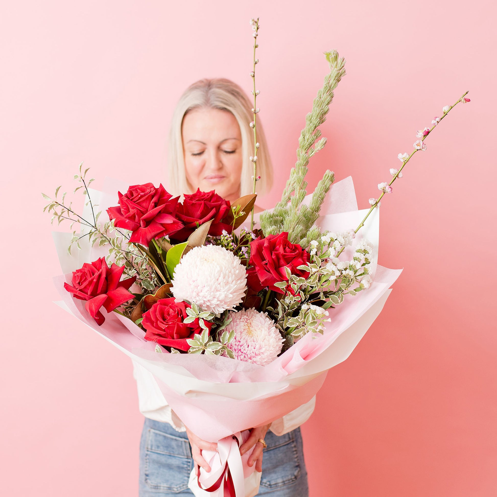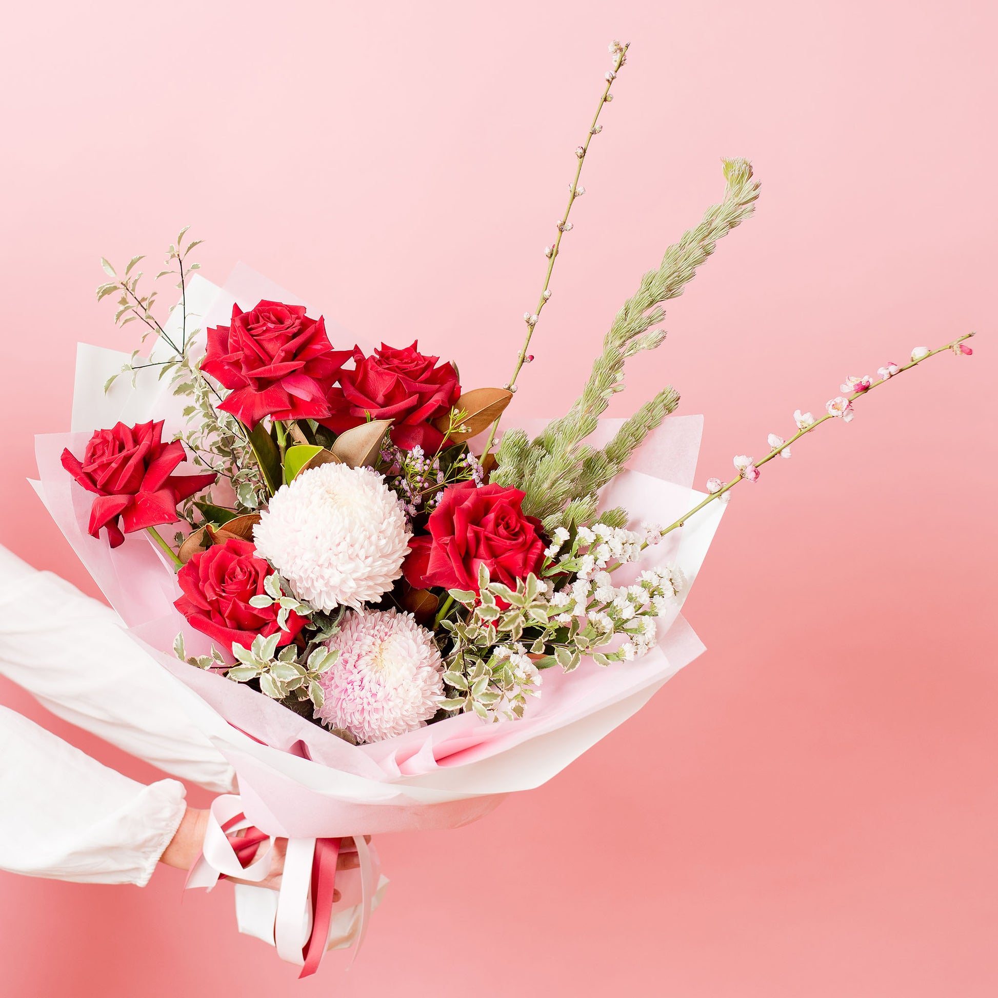 Bouquet will come wrapped in our signature style wrap with water suitable for that day.